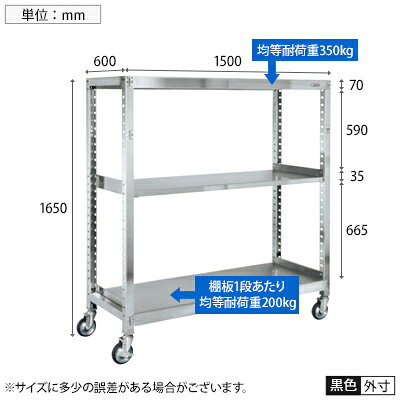 サカエ ステンレスキャスターラックRK型 ゴムキャスター付き 3段 SUS430 幅1500×奥行600×高さ1650mm RKC-5653SU4 ●重荷重対応のタフさと、ボルト8本組み立ての手軽さを両立しました。