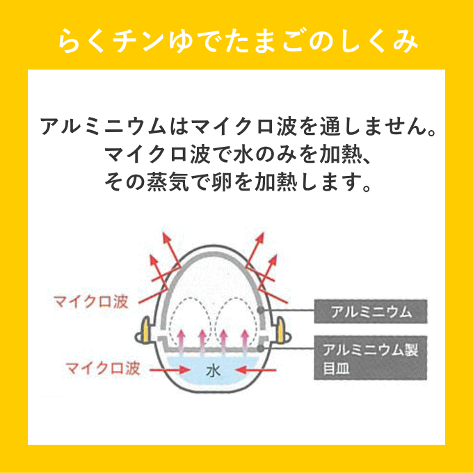 レンジでらくチン!ゆでたまご4個用の解説 固ゆで、半熟、思いのまま! 一度に複数個のゆでたまごが作れるから、忙しい朝に大活躍まちがいなし。