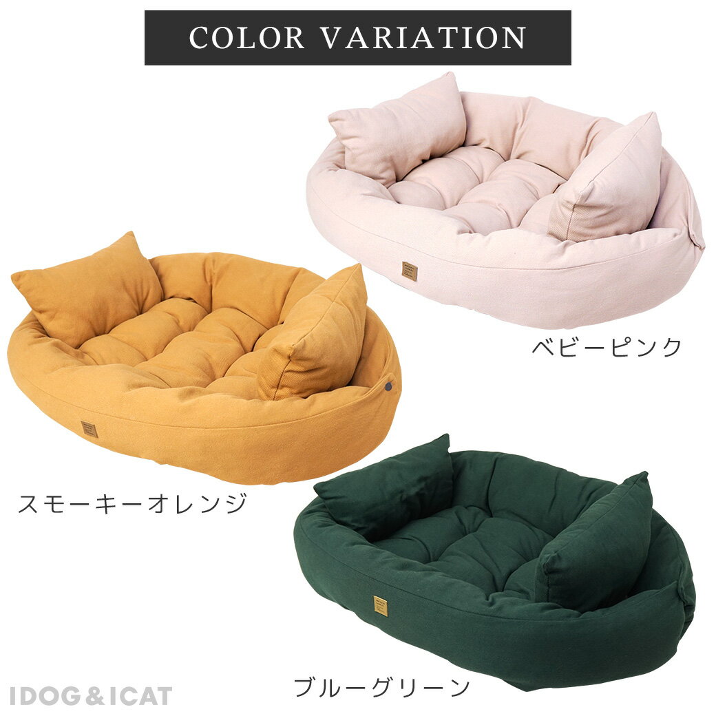 カラー:ベビーピンク/スモーキーオレンジ/ブルーグリーン 素材:綿100% サイズ:ベッドにした状態:(約)幅63cm×奥行52cm×サイド高さ25cm / 内寸(約)幅28×奥行33cm / フラットにした状態:(約)80cm×60cm ※中綿の入り方により表示している数値に多少誤差が生じる場合がございます。
